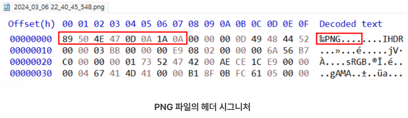 파일 시그니처(File Signature)는 파일의 앞/뒤에 존재하는 고유한 바이트 패턴으로, 파일의 형식을 식별할 수 있도록 도와줍니다.