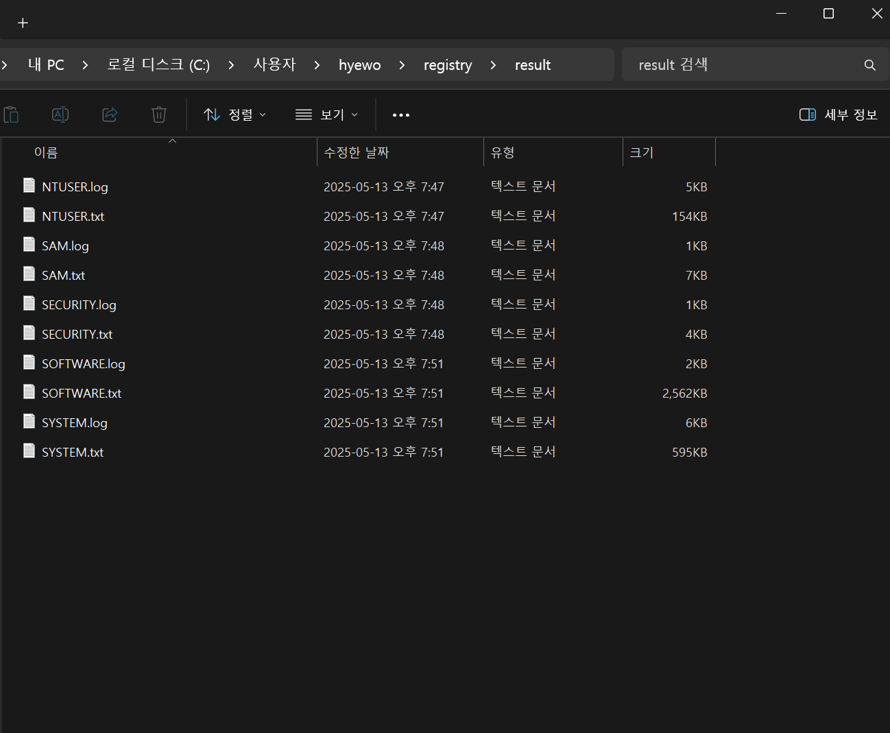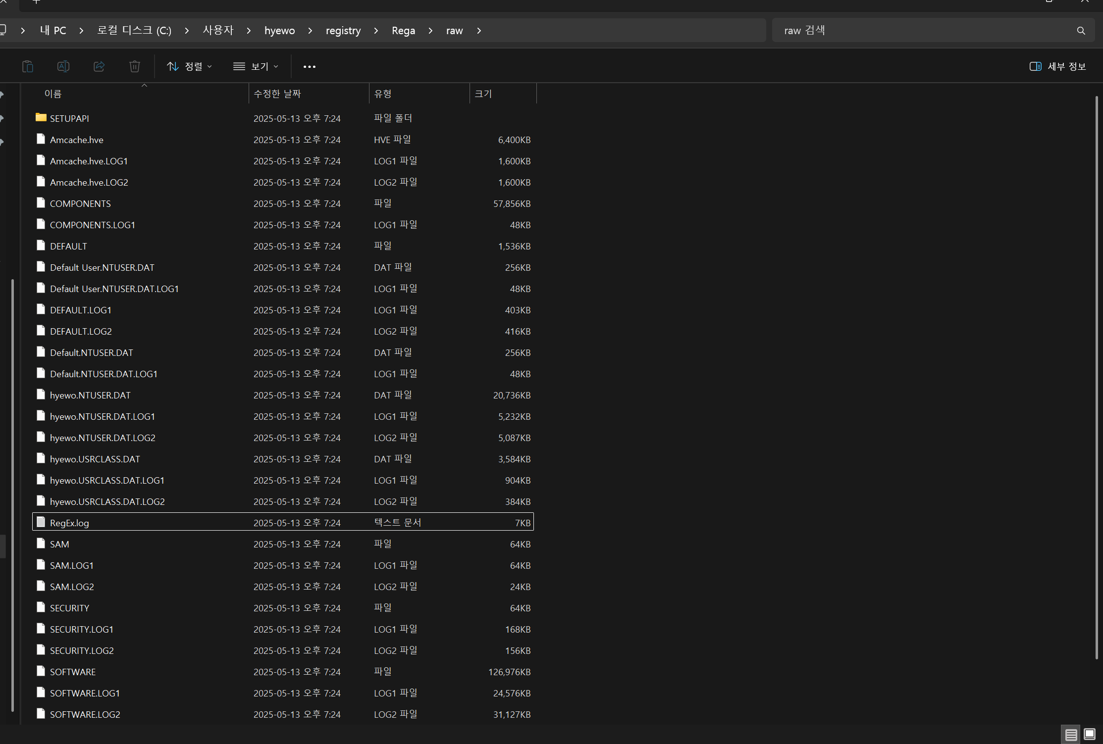 - 운영체제에 의해 자동 생성되는 백업/로그 하이브 파일 존재