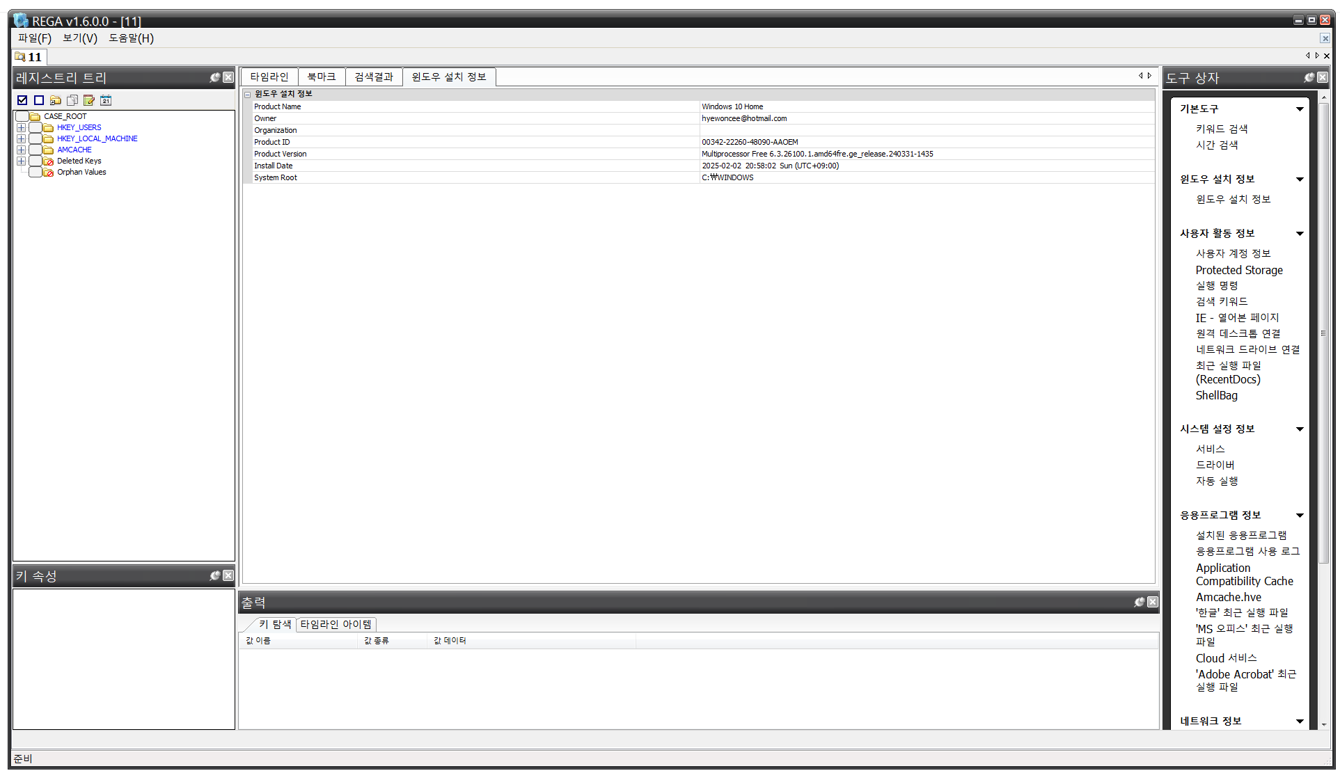 - 윈도우 설치 정보, 계정 정보 확인 가능