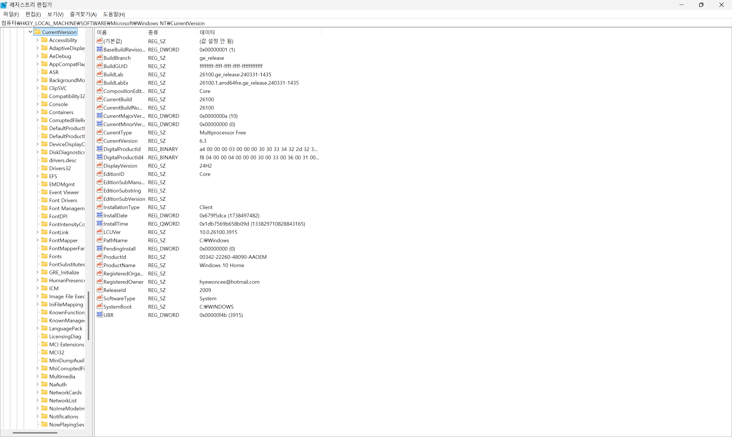 경로: HKLM\SOFTWARE\Microsoft\Windows NT\CurrentVersion