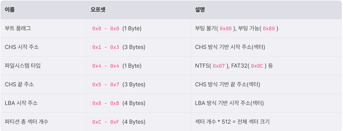 - 그 다음 3바이트 → 시작 위치(CHS)