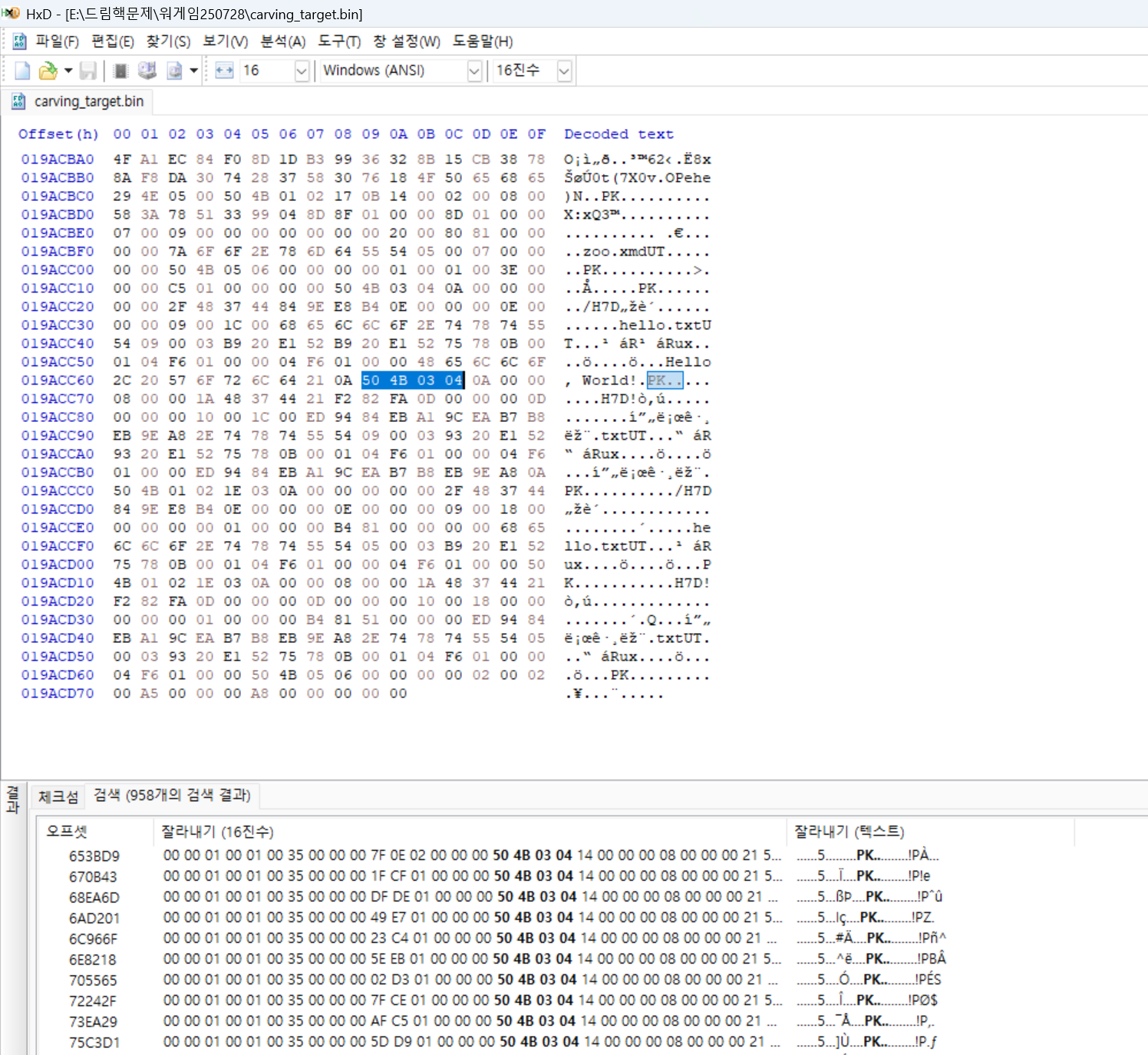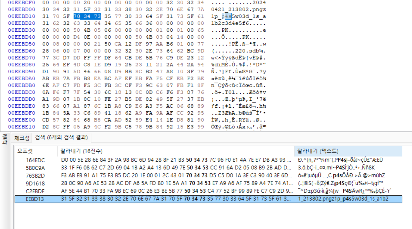 HxD에서 50 4B 03 04 이후 탐색하다 보면 텍스트처럼 보이는 문자열이 나오고