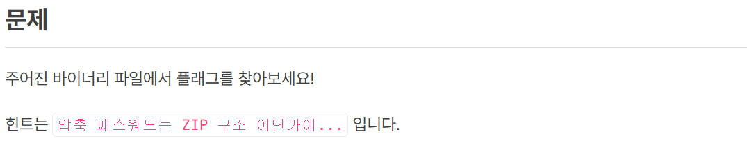 Description[\[함께실습\] structure-based carving](https://learn.dreamhack.io/648)에서 실습하는 문제입니다.주어진 바이너리 파일에서 플래그를 찾아보세요!힌트는 압축 패스워드는 ZIP 구조 어딘가에... 입니다.