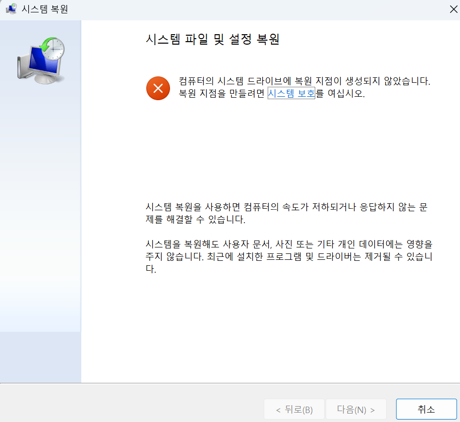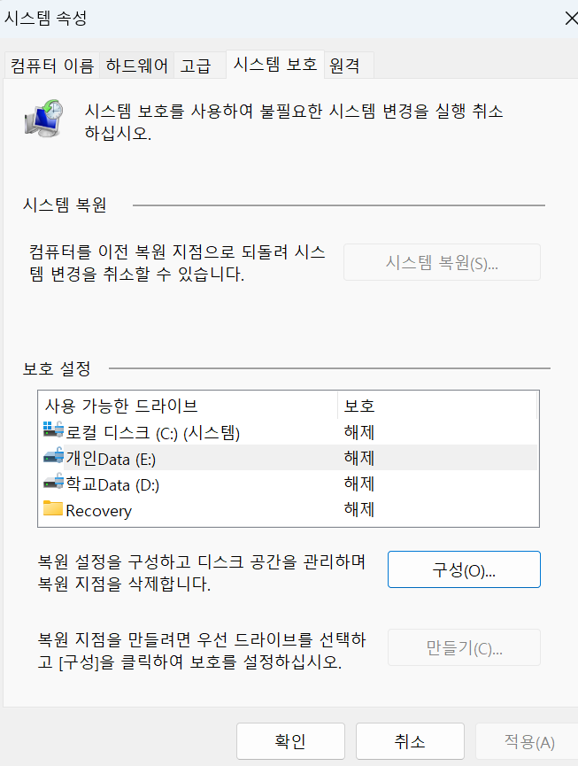 모든 드라이브의 보호 상태가 해제되어 있어서 시스템 복원이 작동하지 않는 상태.