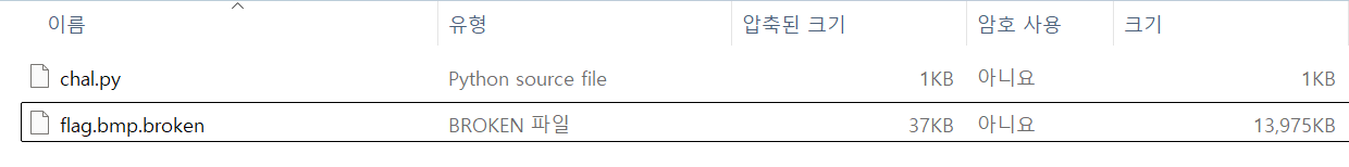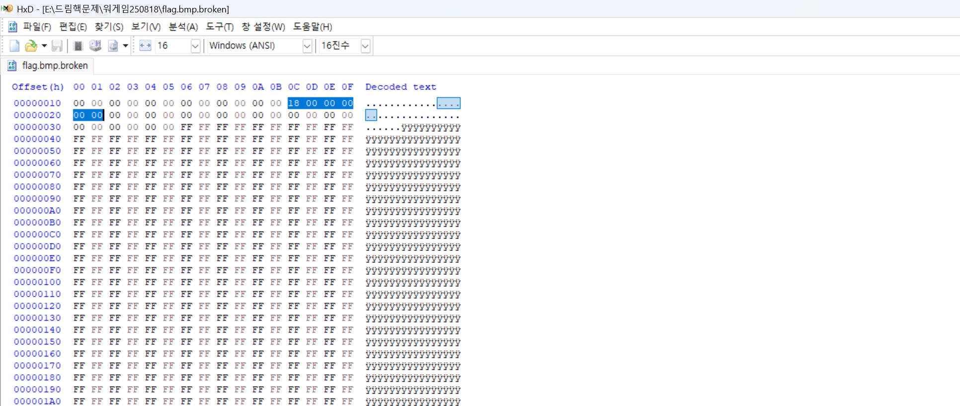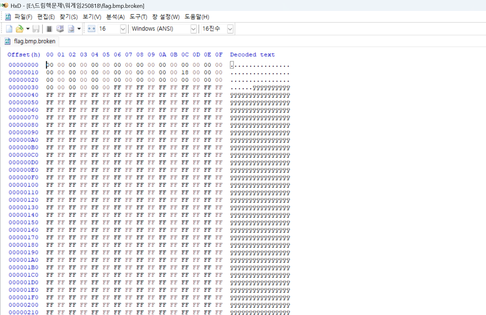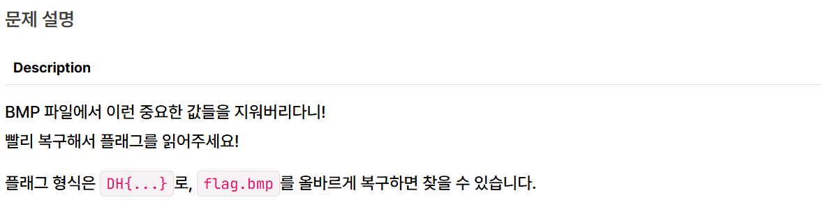 DescriptionBMP 파일에서 이런 중요한 값들을 지워버리다니!빨리 복구해서 플래그를 읽어주세요!플래그 형식은 DH{...}로, flag.bmp를 올바르게 복구하면 찾을 수 있습니다.