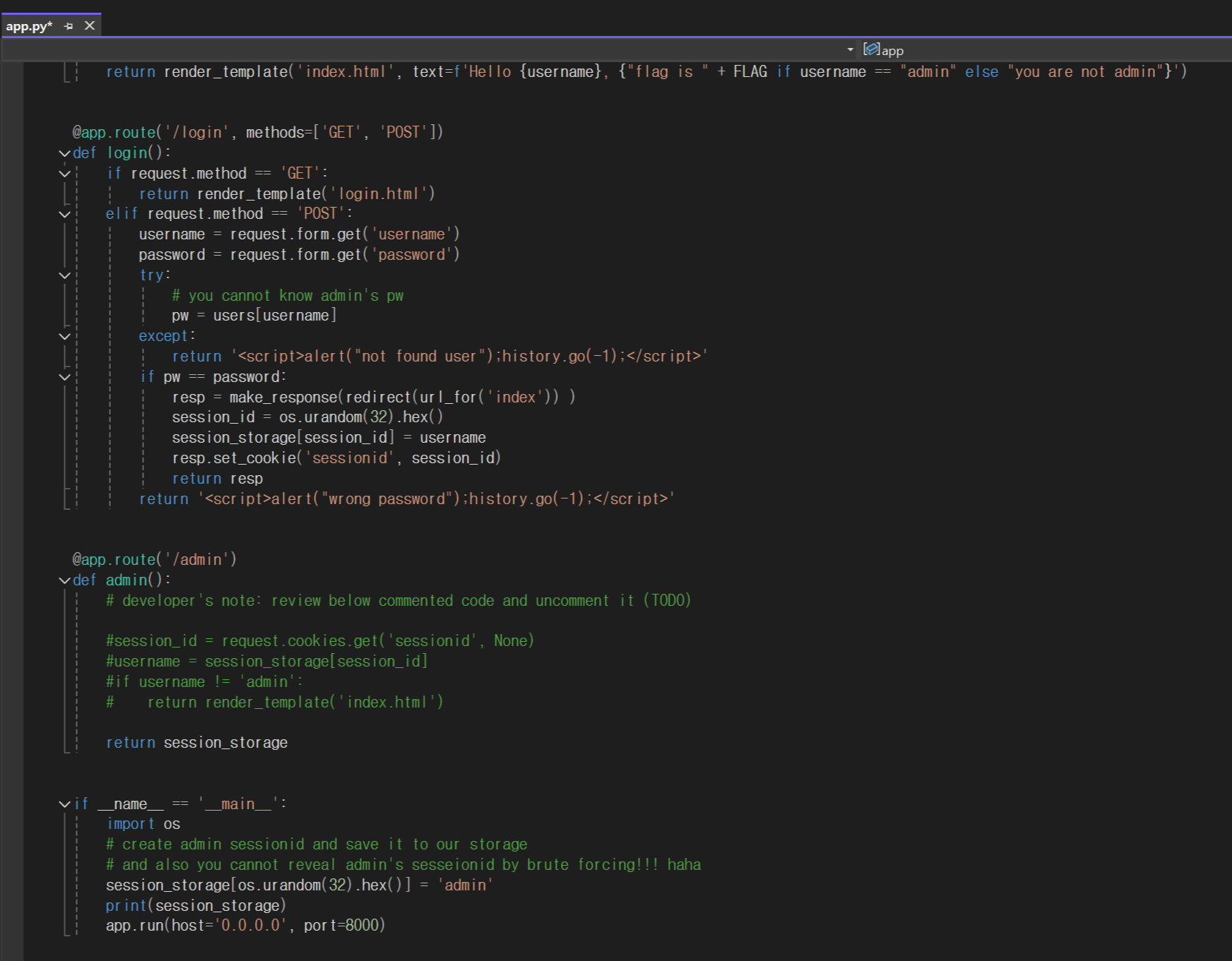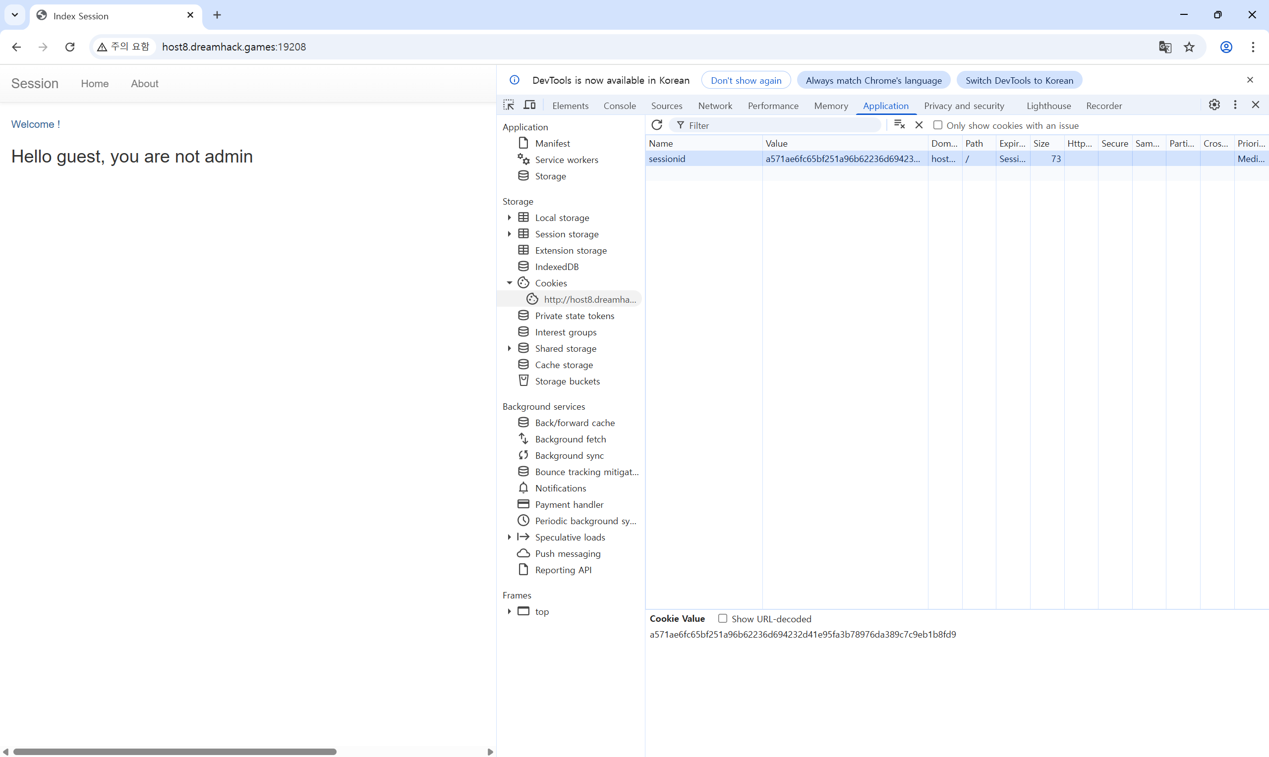 Description쿠키와 세션으로 인증 상태를 관리하는 간단한 로그인 서비스입니다.admin 계정으로 로그인에 성공하면 플래그를 획득할 수 있습니다.플래그 형식은 DH{...} 입니다.ReferenceBackground: Cookie &