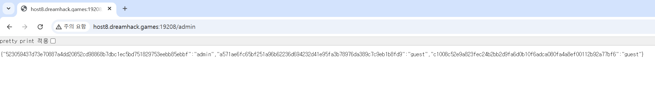 주소창에 http://host8.dreamhack.games:19208/admin 입력하여